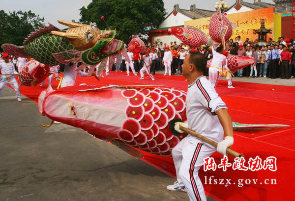 鯉魚(yú)燈用竹篾扎成魚(yú)的骨架,糊上薄棉紙,加上彩繪,魚(yú)長(zhǎng)5尺,寬2尺許,魚(yú)腹處裝上一支竹棒,供舞魚(yú)燈者舉著表演。魚(yú)燈隊(duì)的組成也多種多樣,舞九只鯉魚(yú)和鱷魚(yú)者,稱(chēng)“九鯉升天”;舞一只鯉魚(yú)和一只鱸魚(yú),后面跟著若干只鱷魚(yú)和一只麒麟,鱷與岳諧音,五條鱷魚(yú)代表中華大地的泰山、恒山、嵩山、華山、衡山五岳,麒麟代表天因而稱(chēng)“五鱷朝天”,象征天地和人河山統(tǒng)一。一魚(yú)一人舞,一人替代,鯉魚(yú)燈表演者左右手上下交替,魚(yú)身左右搖擺,來(lái)回穿梭,活象在海里游弋一樣,舞蹈的構(gòu)圖有“一條龍”、“行盤(pán)織”等,晚上表演時(shí)魚(yú)燈點(diǎn)燃,整條魚(yú)亮閃閃的很是逼真。伴奏樂(lè)器主要有吹奏樂(lè)器大嗩吶,打擊樂(lè)器大鼓、大鑼、大鈸等,吹奏的都是正字戲的昆牌子,音樂(lè)雄渾豪放,舞蹈熱情奔放。
