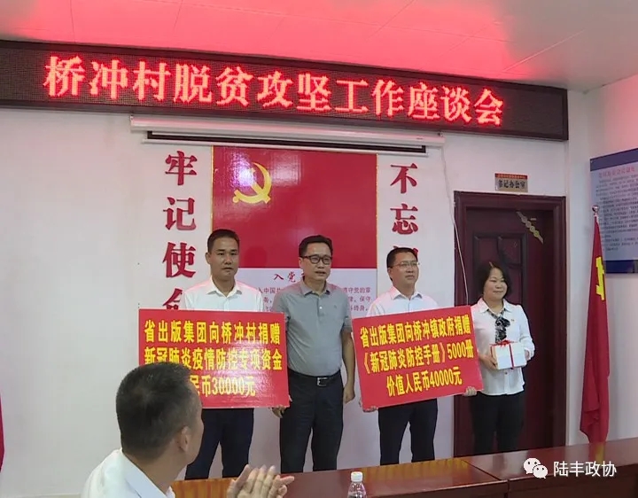 省出版集團黨委書記、董事長譚君鐵一行來到橋沖鎮橋沖村后,與鎮、村相關負責同志一起召開脫貧攻堅工作座談會,聽取了解駐村工作隊和橋沖村有關脫貧攻堅工作情況匯報。橋沖村下轄橋沖、東林和西湖三個自然村,全村共1634戶9760人。2016年起由省出版集團對口幫扶。四年來,在各級黨委政府的堅強領導下和省出版集團的大力幫扶下,緊緊圍繞“兩不愁、三保障、一相當”,堅持抓黨建促脫貧攻堅,重點推進產業發展扶貧等“八項工程”,落實扶貧政策,實施精準幫扶。到2019年底,共計投入扶貧資金和物資約2381萬元,開展村基層黨建、飲用水安全、技能培訓等項目,實現了相對貧困戶200戶924人已全部退出,貧困戶脫貧率達到100%。