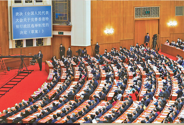 2021年3月11日,十三屆全國人大四次會(huì)議表決通過《全國人民代表大會(huì)關(guān)于完善香港特別行政區(qū)選舉制度的決定》。這是繼制定實(shí)施香港國安法后,中央依法治港的又一重大舉措。3月30日,十三屆全國人大常委會(huì)第二十七次會(huì)議通過了新修訂的香港基本法附件一和附件二。隨后,香港特別行政區(qū)完成本地立法。新選舉制度為推進(jìn)香港民主穩(wěn)步發(fā)展、實(shí)現(xiàn)良政善治,促進(jìn)“一國兩制”實(shí)踐行穩(wěn)致遠(yuǎn)打下堅(jiān)實(shí)基礎(chǔ)。這是表決現(xiàn)場(chǎng)。 新華社記者 張玉薇/攝