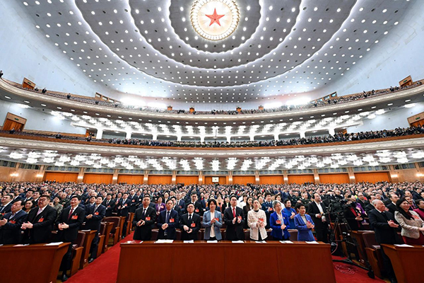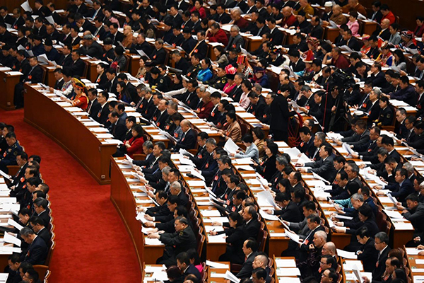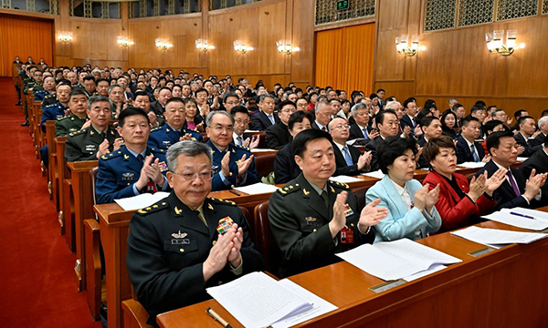△委員們對王滬寧主席關于政協全國委員會常務委員會工作的報告報以掌聲。本報記者 姜貴東 攝