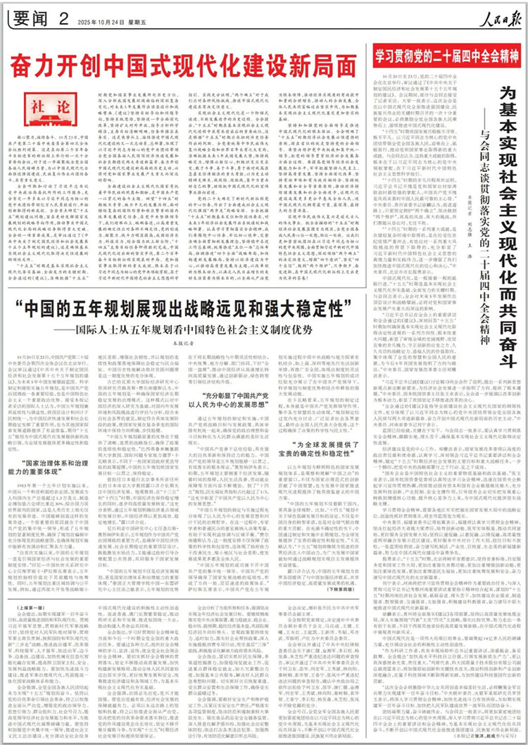 “十五五”時期是基本實現社會主義現代化夯實基礎、全面發力的關鍵時期。全會通過的《建議》,準確把握“十五五”時期黨和國家事業發展所處歷史方位,深入分析我國發展環境面臨的深刻復雜變化,對未來5年發展作出頂層設計和戰略擘畫。《建議》堅持目標導向和問題導向,堅持系統思維,堅持進一步全面深化改革,堅持擴大對外開放,指導方針科學精準,主要目標清晰明確,任務舉措求真務實。這是乘勢而上、接續推進中國式現代化建設的又一次總動員、總部署,體現了以習近平同志為核心的黨中央團結帶領全黨全國各族人民續寫經濟快速發展和社會長期穩定兩大奇跡新篇章、奮力開創中國式現代化建設新局面的歷史主動,必將對黨和國家事業發展產生重大而深遠的影響。