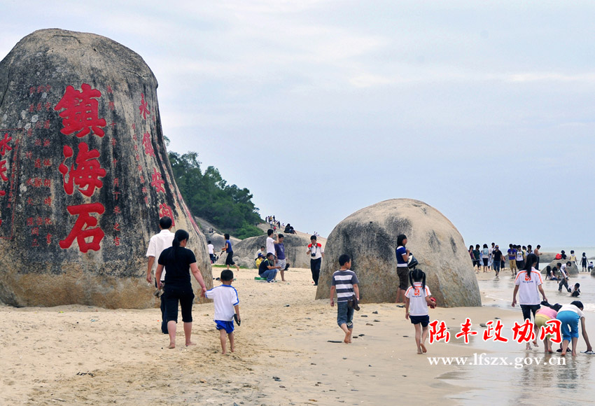 金廂海灘長達10公里,海中距岸100米處水深才1.5米,坡緩、沙白、水清、浪小,是開發海浴場,海上觀光,以及帆板、潛水等海上運動的理想場所。分布于海岸和海中的奇礁異石眾多,其中有高達14米,面積3000平方米的“龍石”,其狀如一巨龍在海邊飲水,故稱“仙龍飲海”,從遠處眺望,其造型栩栩如生。石上鐫刻著我國現代著名詩人、版畫家、書法家賴少其為紀念周恩來、葉挺、聶榮臻等老一輩革命家1927年搶渡香港而作的詩詞。該詩為五言詩:“洲渚夜如釜,遙天一砥柱。搶渡碣石灣,猛如下山虎。”還有汕尾市境內最大的摩崖石刻“鎮海石”,該石聳立于沙灘上,石上有明、清兩代朝廷命官的題詞。在鎮海石旁的一處石崖上,有當代書法家啟功先生的題詞“粵東旅游黃金海岸”石刻。海面上分布有各種象形石,有企鵝石、雙疊石、官牌坊石等。以上的摩崖石刻,其書法藝術屬祖國的文化遺產,每一個石刻都有一段神奇的故事。奇礁異石、書法石刻構成了金廂灘的一大景觀。?