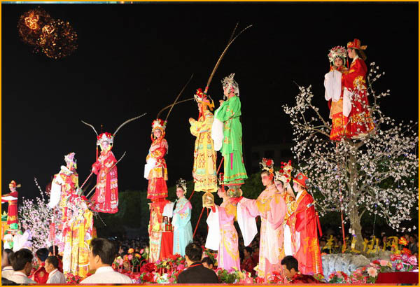 飄色表演的節(jié)目內(nèi)容有《雙白燕》、《金山戰(zhàn)鼓》、《三關(guān)擺宴》、《穆桂英掛帥》、《妙嫦追舟》、《白蛇傳》、《鳳儀亭》、《荔鏡記》等五十多個(gè)節(jié)目。